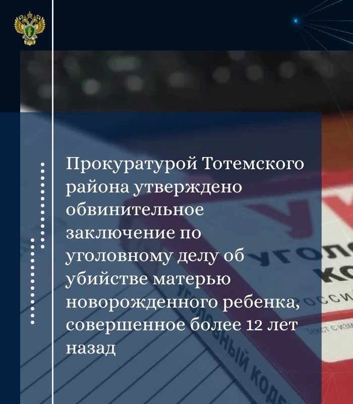 Прокуратурой Тотемского района утверждено обвинительное заключение по уголовному делу в отношении 35 летней жительницы Тотемского района. Она обвиняется по ст. 106 УК РФ (убийство матерью новорожденного ребенка).