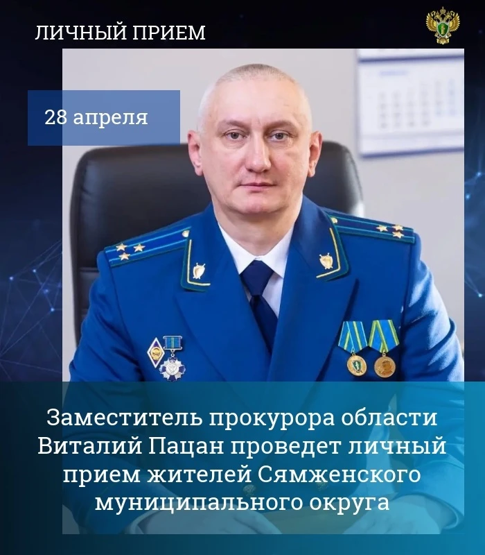 Заместитель прокурора Вологодской области Виталий Пацан 28 апреля 2026 года проведет личный прием жителей Сямженского округа.
