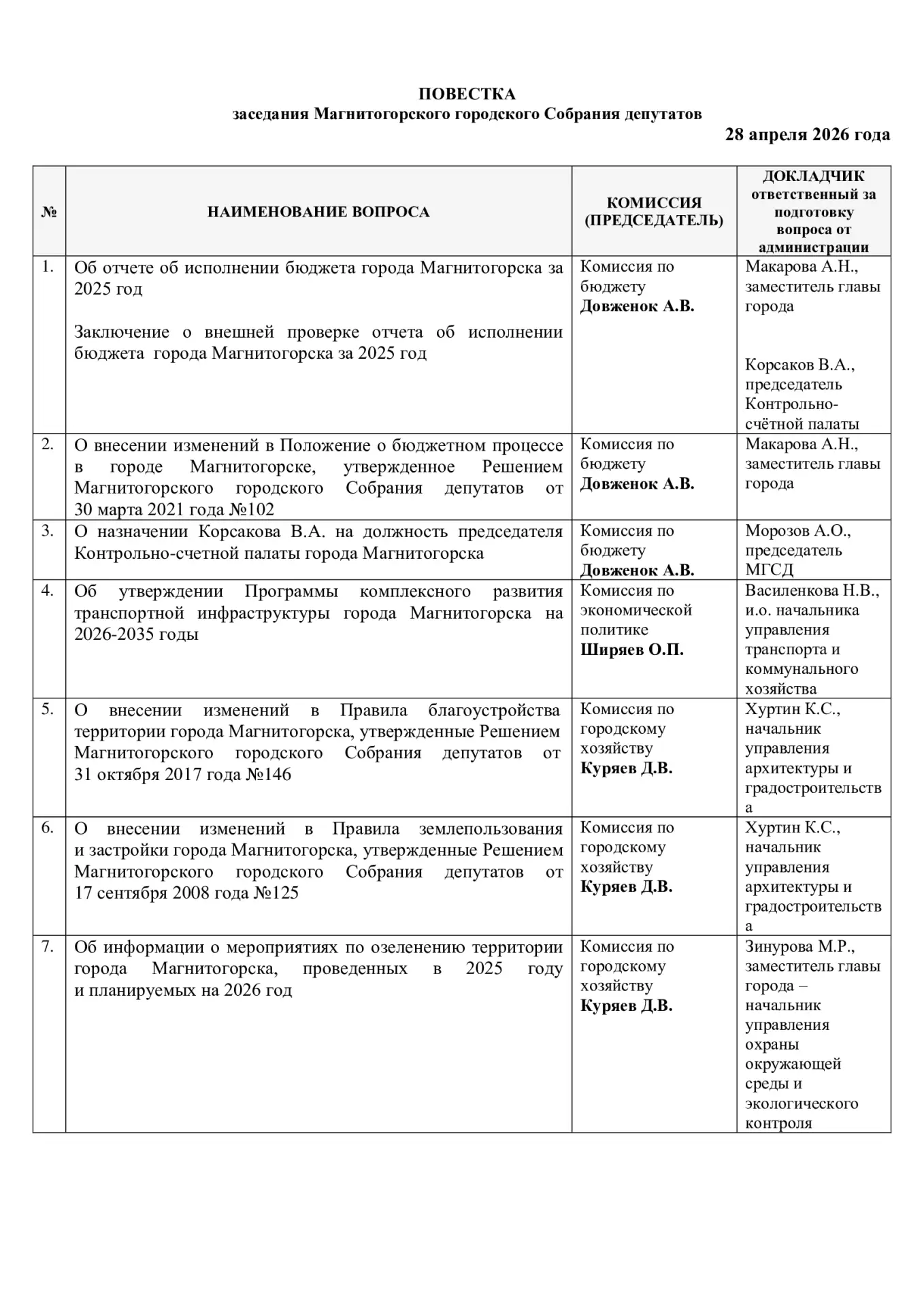 В рамках контрольных полномочий депутатами будут заслушаны итоги по управлению имуществом, находящимся в муниципальной собственности, по озеленению города, а также по осуществлению муниципального контроля за 2025 год.