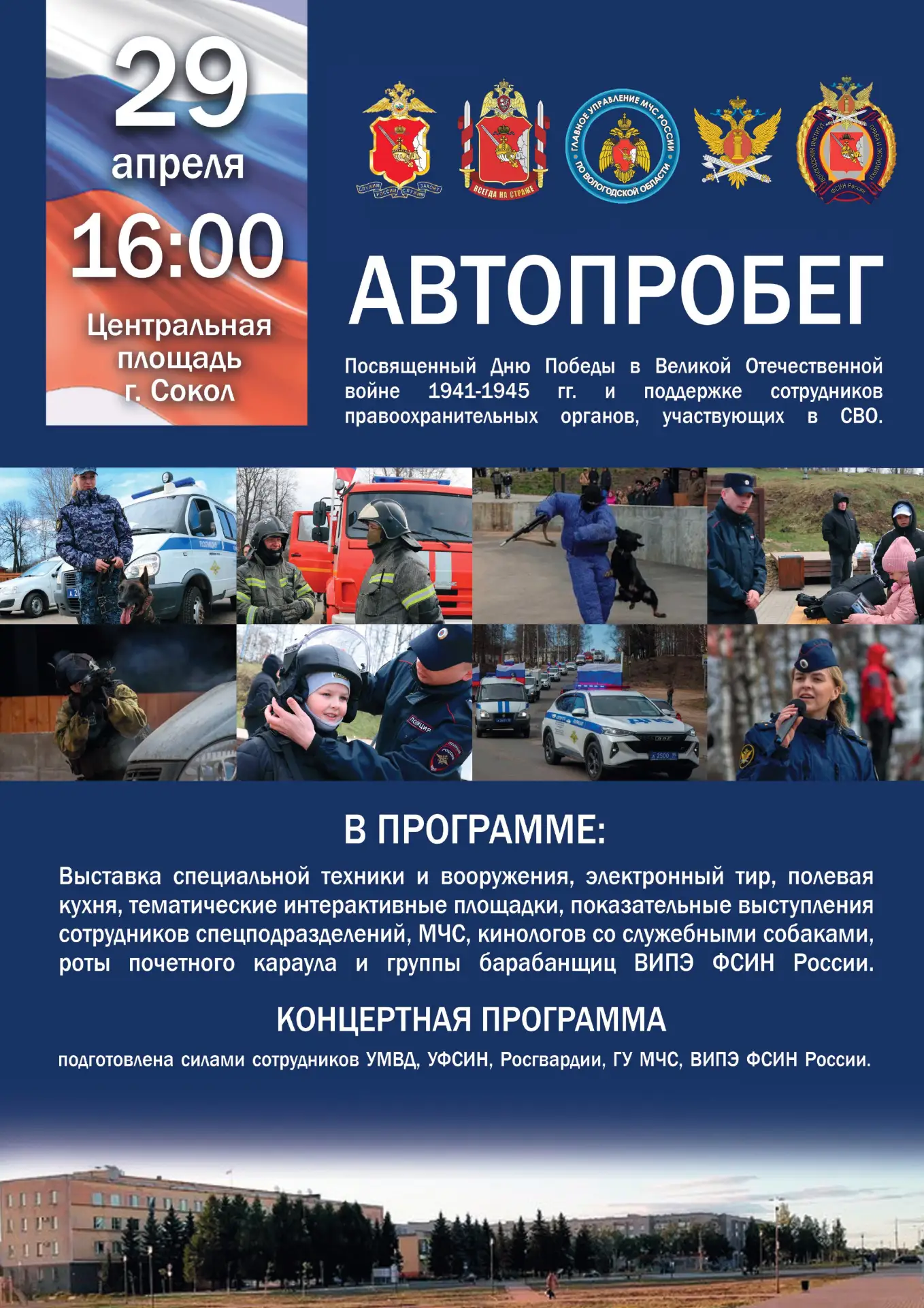 Завтра в 16:00 на Центральной площади г. Сокола состоится автопробег, посвященный Дню Победы в Великой Отечественной войне.
