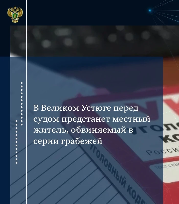 Великоустюгской межрайонной прокуратурой утвержден обвинительный акт по уголовному делу в отношении 27-летнего жителя г. Великий Устюг. Он обвиняется в 6 эпизодах преступления, предусмотренного ч.1 ст.161 УК РФ (грабеж).