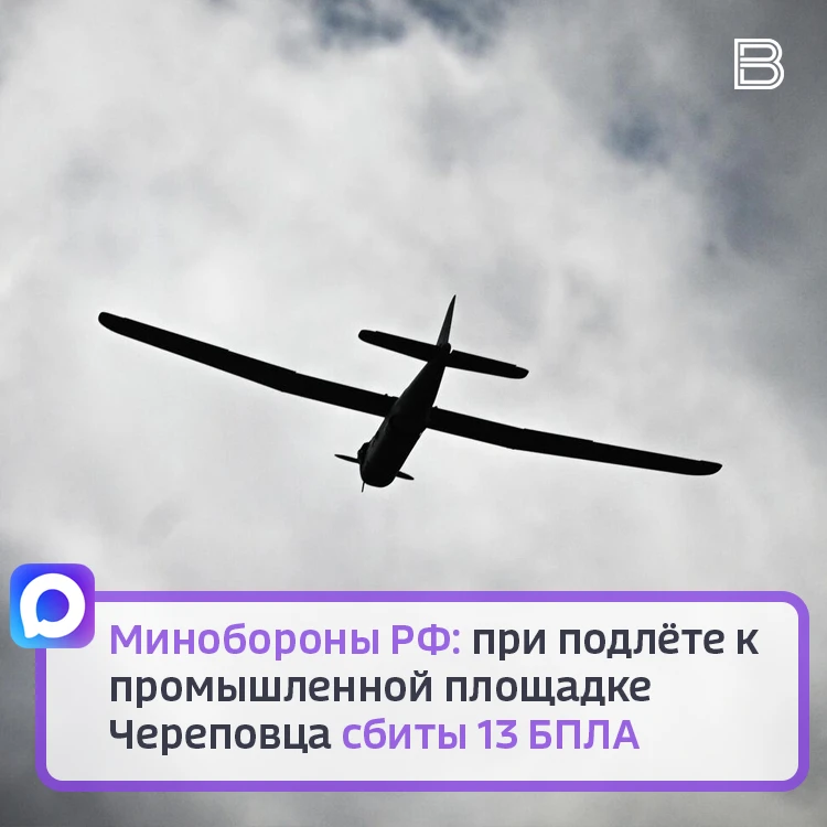 По уточнённым данным Минобороны РФ, на территории Вологодской области, при подлёте к одной из череповецких промышленных площадок, сбиты 13 беспилотников. На месте падения обломков работают специалисты экстренных служб.