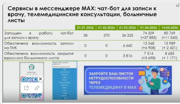 Чат-бот для записи к врачу на 14 апреля 2026 года зарегистрировал 85 769 пользователей, что на 11 560 больше, чем в марте 2026 года.