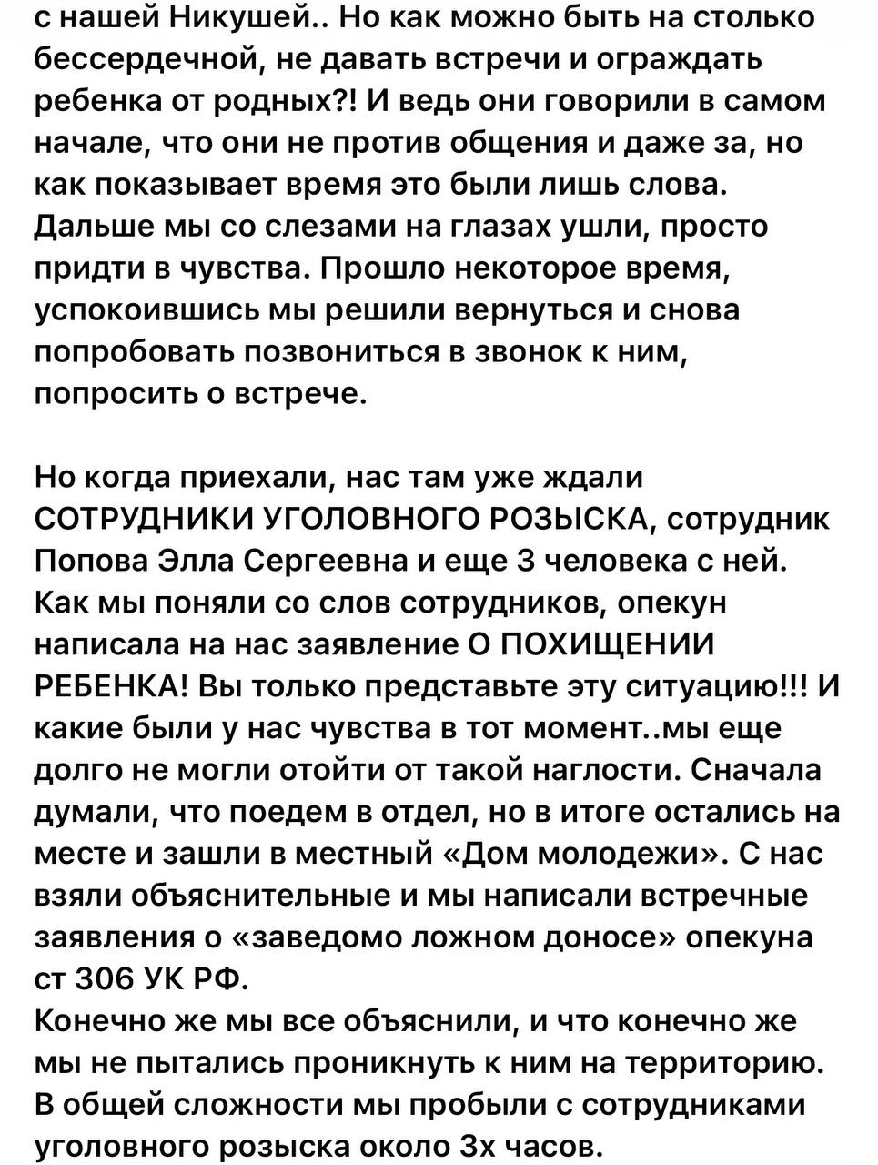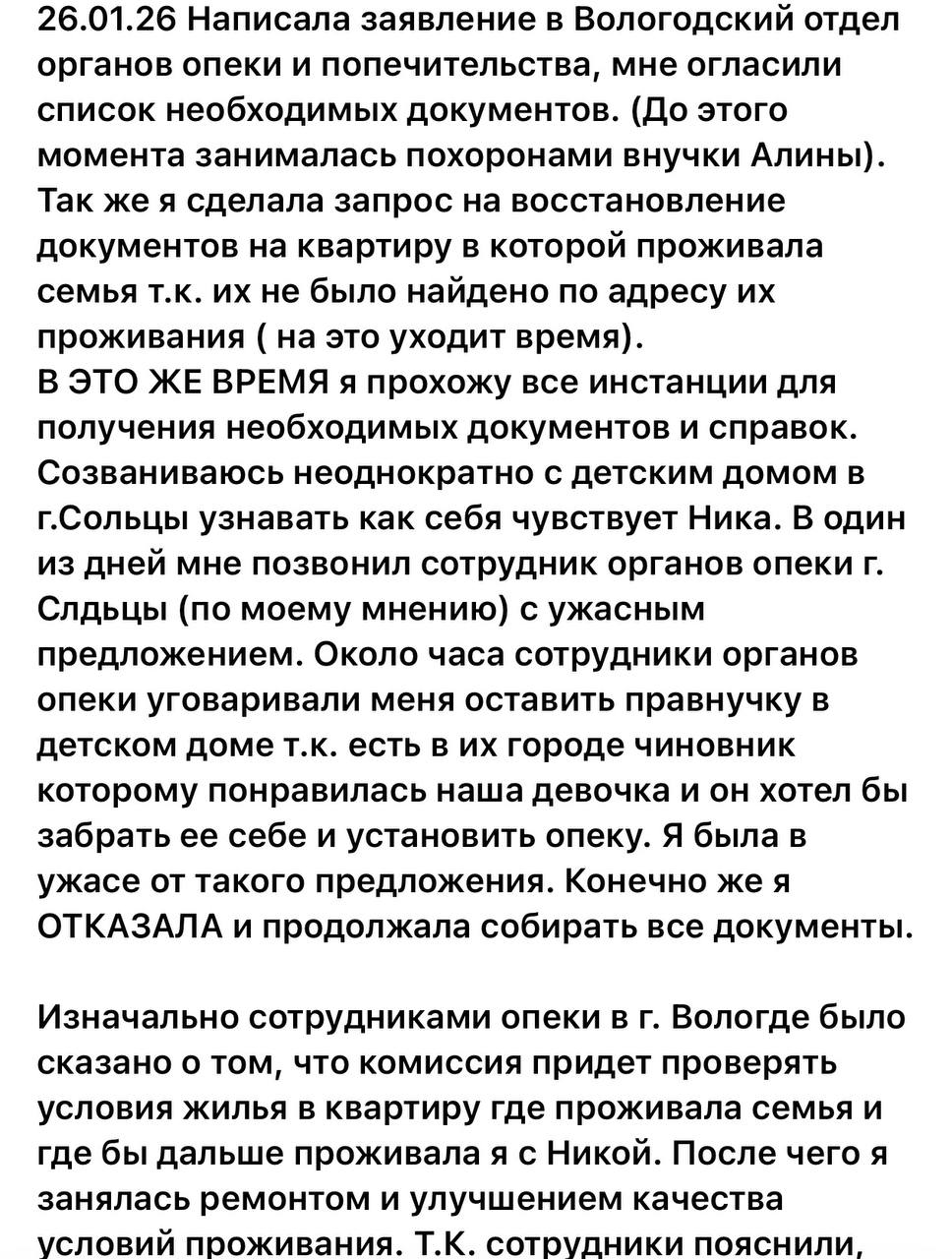 Женщина пыталась сразу оформить документы на опеку и увидеться с девочкой после того, как узнала, что её внучка погибла. Но всякий раз чиновники чинили препятствия и затягивали процедуру оформления, выдвигая новые требования. Как утверждает семья, органы опеки в Сольцах прекрасно знали, что прабабушка готовит документы, однако в это же время они, как выяснилось, рассматривали других кандидатов. Вернее, одного - супругу главы администрации своего муниципального округа, которая наскоро отучилась в школе приемных родителей.