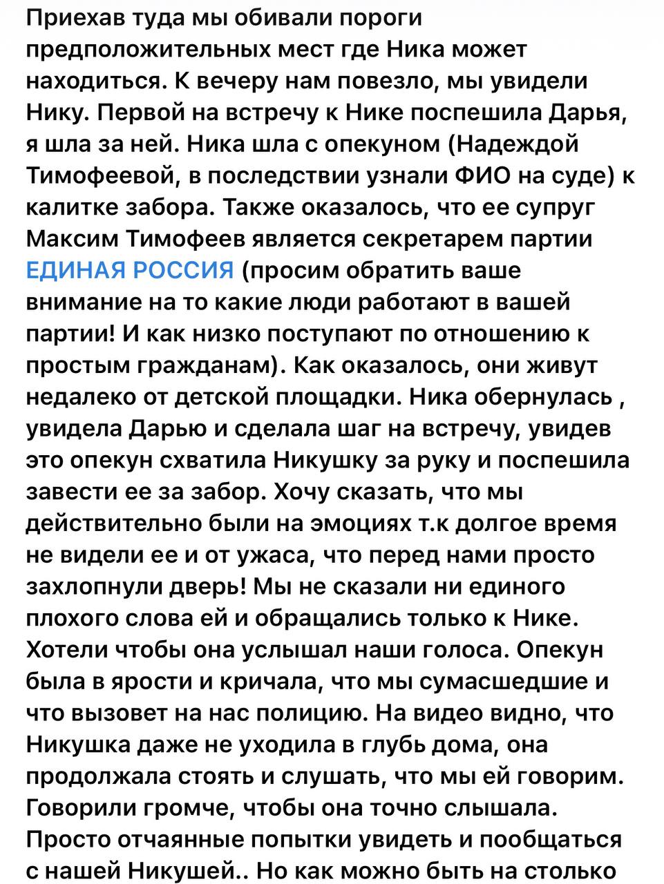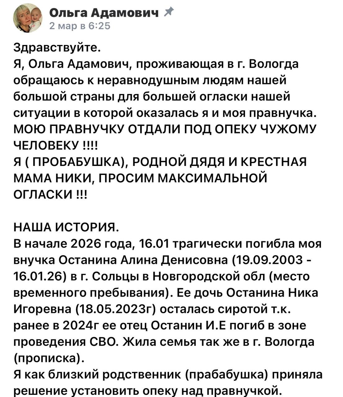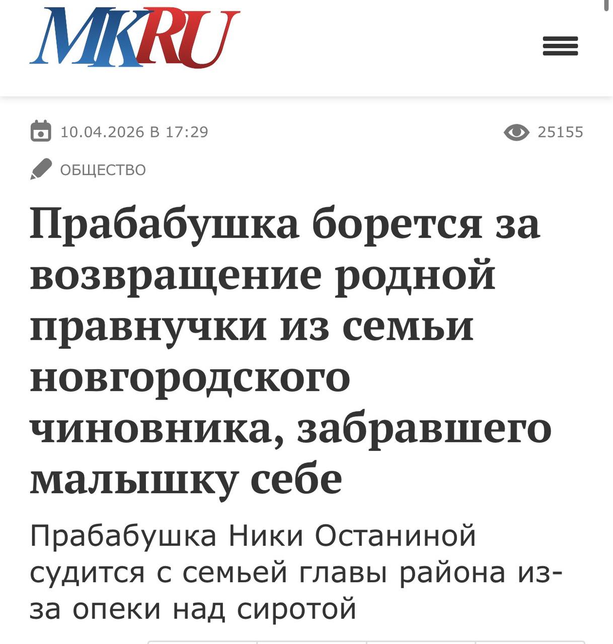 Отец девочки погиб в ходе СВО, выполняя воинский долг. А в январе этого года мама девочки погибла в ДТП. Двухлетнюю малышку хотела забрать под опеку её родная 65-летняя прабабушка домой в Вологду, но не тут то было. Девочку передали под опеку чиновнику, который … курирует вопросы опеки и попечительства. Как пишет МК, права на воспитание ребенка были переданы опекой семье главы Солецкого муниципального округа Максима Тимофеева. Любые попытки прабабушки увидеться с ребенком заканчивались вызовом полиции и разбирательствами - её обвиняли в попытке «похитить» ребенка.