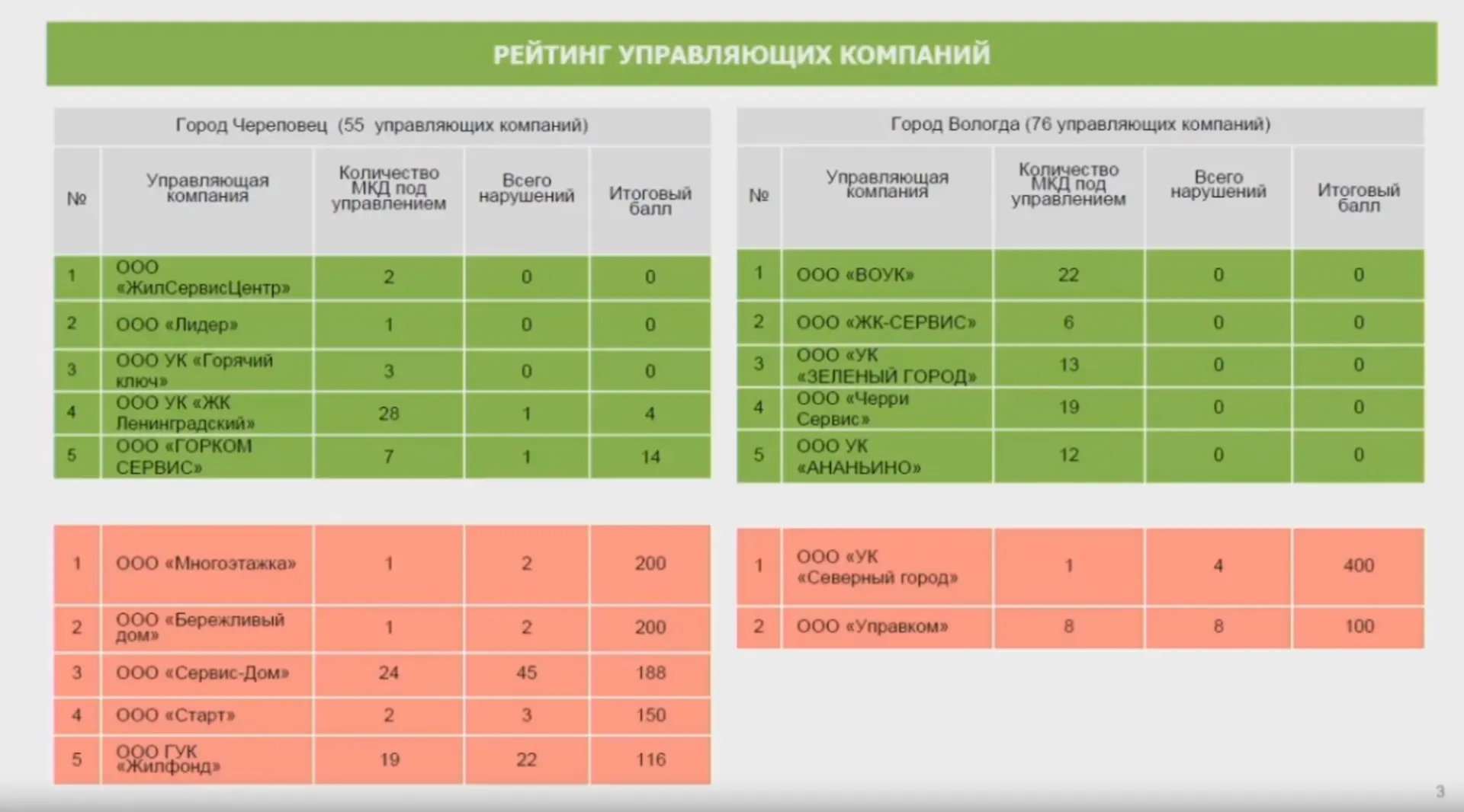 Доклад губернатору представил замгубернатора Антон Стрижов.В рейтинге управляющих компаний Вологды и Череповца лидируют:В Вологде: ООО «ВОК», ООО «ЖК-СЕРВИС», ООО «ЖК «ЗЕЛЕНЫЙ ГОРОД».В Череповце: ООО «ЖилСервисЦентр», ООО «Лидер», ООО УК...