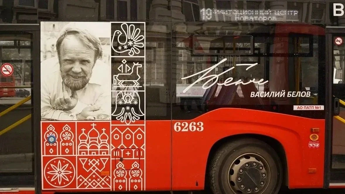 В Вологде запустили автобусы в честь писателей Николая Рубцова и Василия Белова. На бортах — портреты, цитаты и фрагменты произведений. Внутри — строки на цифровых экранах.