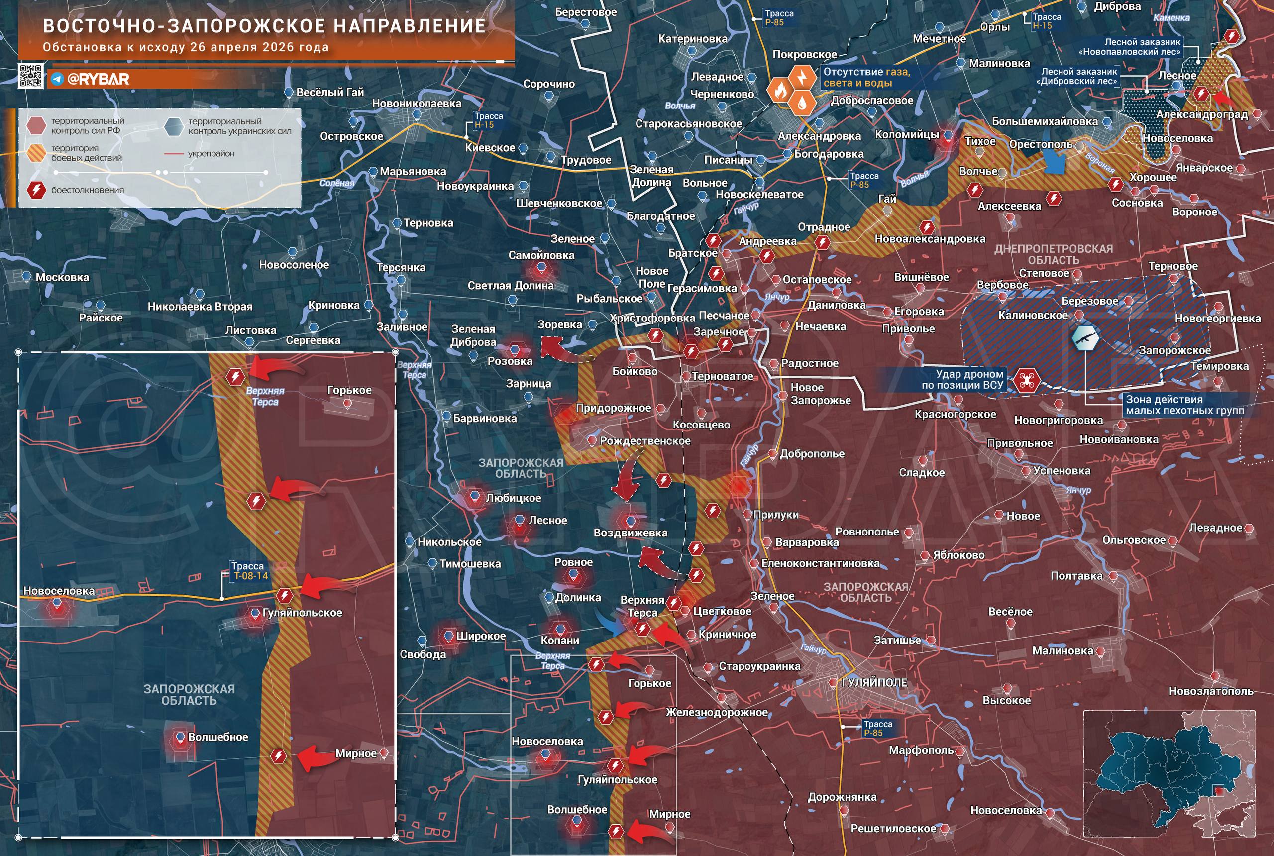 На северном фланге Восточно-Запорожского направления ВС РФ ведут обход и зачистку окрестностей освобожденных ранее населенных пунктов, южнее штурмовики пробиваются к Гуляйпольскому. Одна из групп просачивания ВСУ была замечена в окрестностях Новогригоровки и впоследствии разбита ударами FPV.