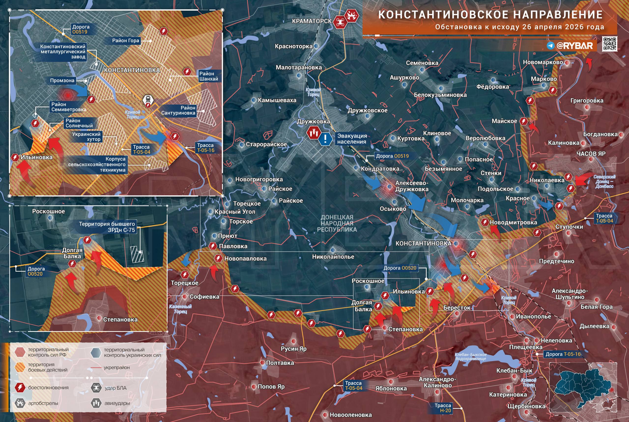 На Константиновском направлении украинские формирования проводят локальные контратаки у сельскохозяйственного техникума. Российские войска пытаются закрепиться в микрорайоне Семиветровка и пробиваются к центру Долгой Балки.