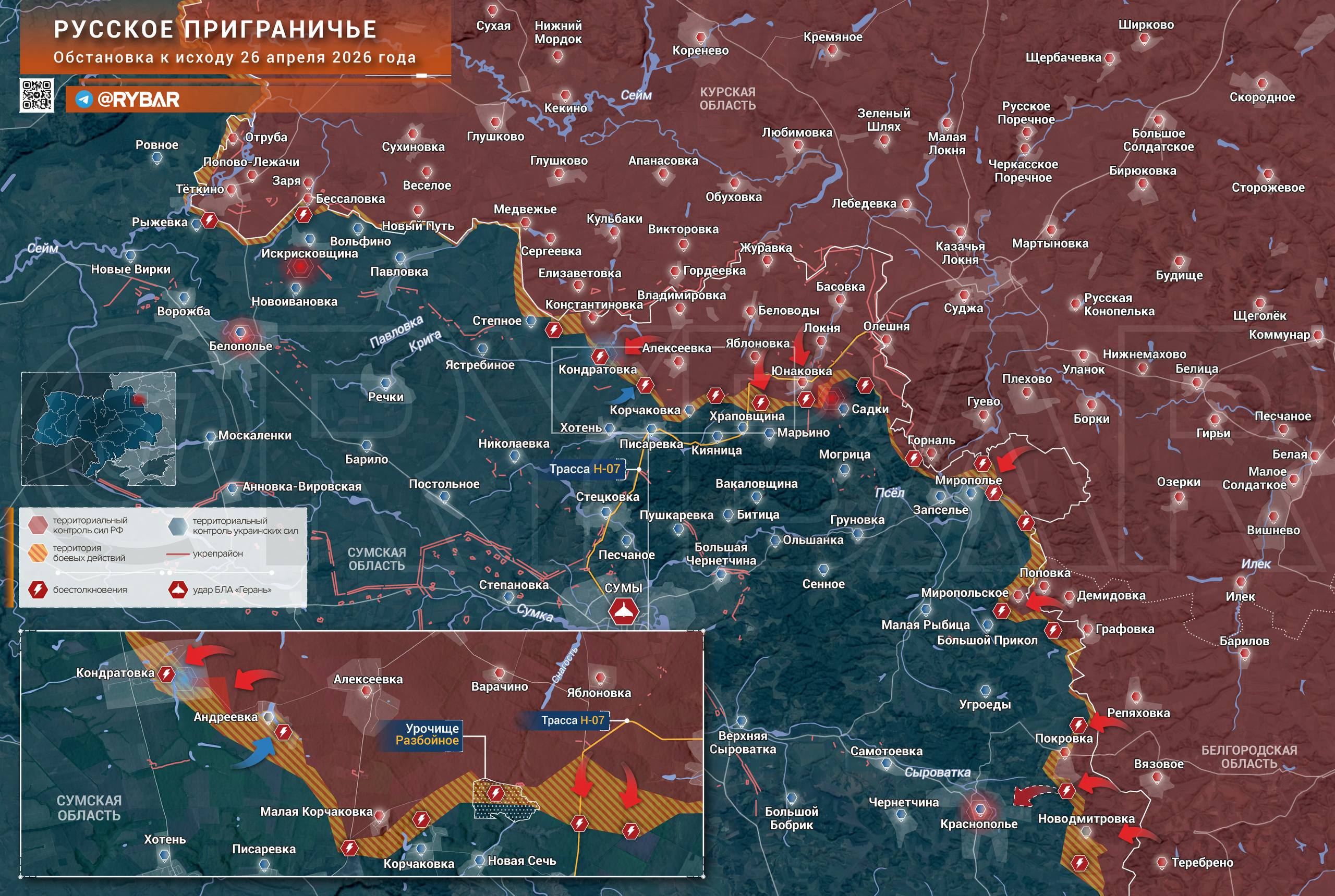 На Сумском направлении бойцы ГВ «Север» расширяют зону контроля севернее трассы Н-07. Некоторое время назад штурмовики выбили ВСУ из нескольких позиций на окраинах Кондратовки и теперь продвигаются к центру населенного пункта.