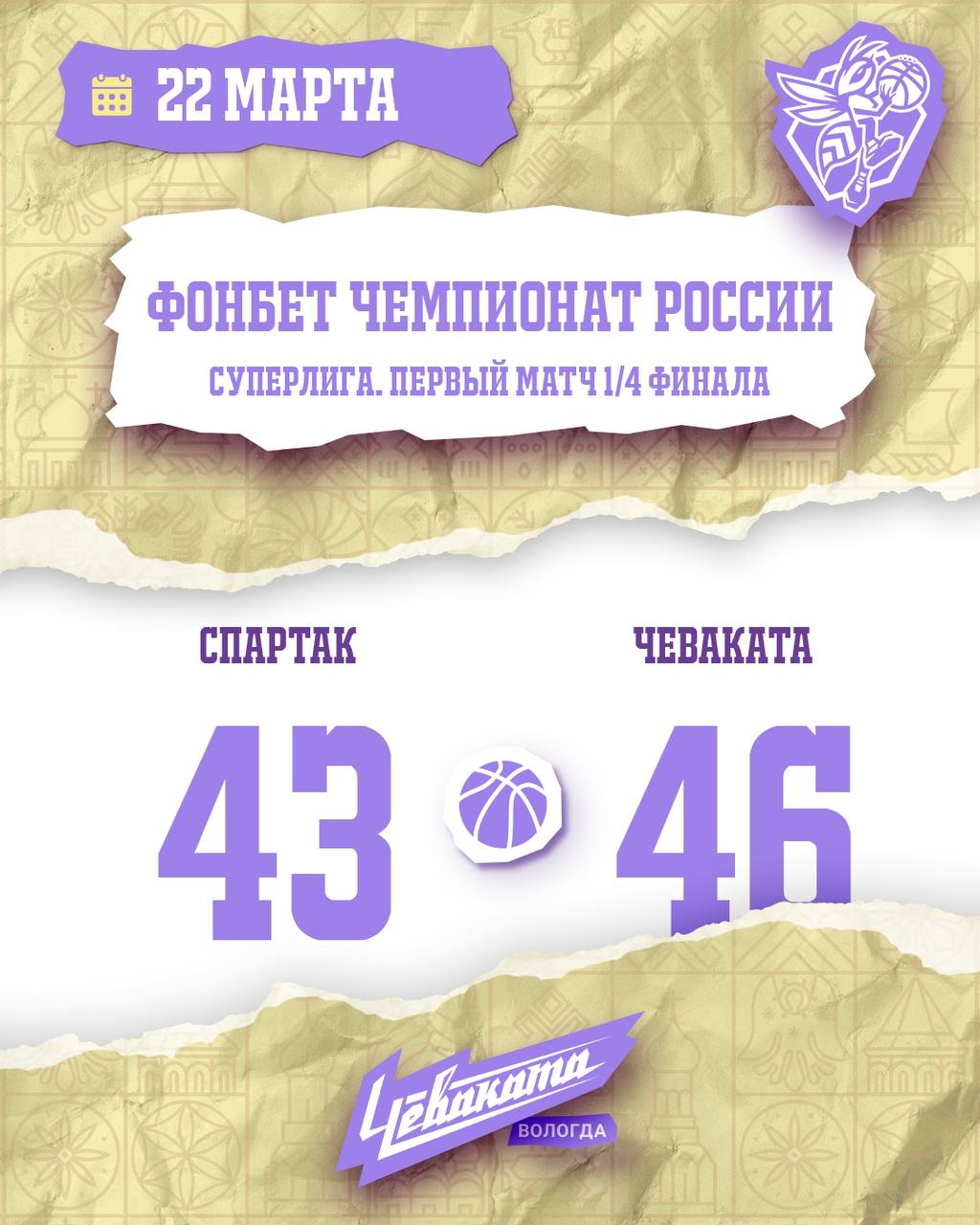 Баскетболистки "Вологда-Чевакаты" в первом матче серии 1/4 финала женской Суперлиги выиграли в Санкт-Петербурге у местного "Спартака" со счётом 46:43.Вторая игра соперников пройдет в Вологде 28 марта.