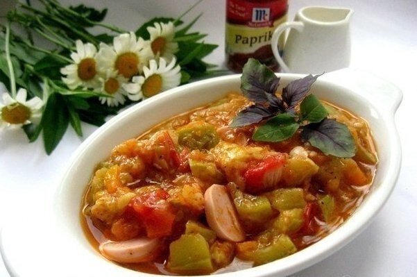 После того как овощи станут мягкими, следует добавить помидоры, порезанные сосиски и предварительно раздавленный чеснок. Не забудьте посолить и поперчить по вкусу. Закройте крышкой и тушите на небольшом огне еще 10-15 минут, пока все вкусы не смешаются.