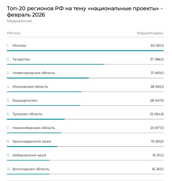 Наш регион занял 10-е место в медиарейтинге регионов России по теме «национальные проекты» за февраль 2026 года. Рейтинг подготовила компания «Медиалогия».