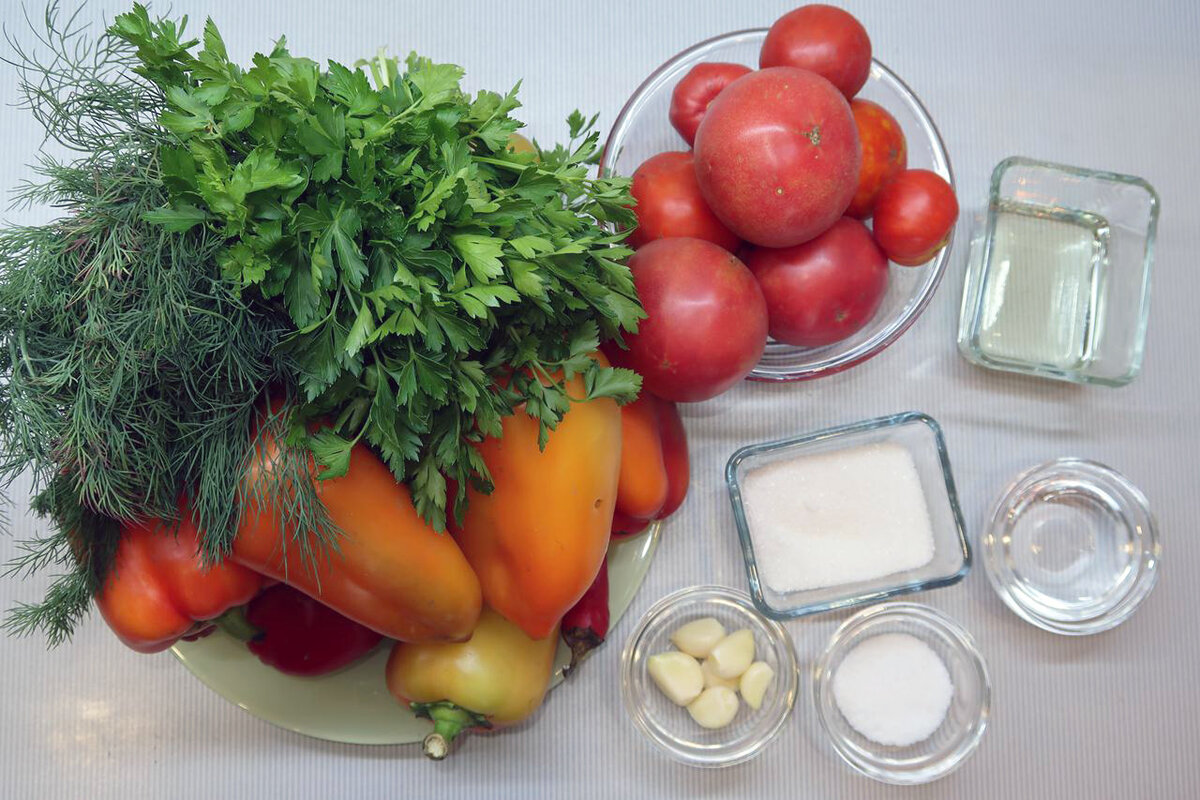 4. Полученную томатную массу смешать с болгарским перцем, зеленью, солью, сахаром, растительным маслом и уксусом. Выложить все в глубокую кастрюлю, перемешать и накрыть крышкой.