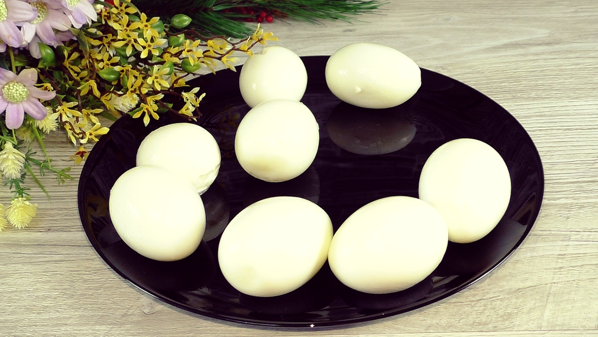 Для начала яйца нужно отварить. Поместите их в кастрюлю и залейте холодной водой, доведите до кипения и варите 10 минут. Затем охладите их под холодной водой и очистите.