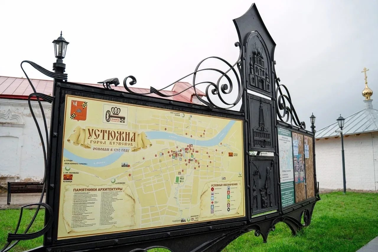 Знаки указывают на направление Устюженского краеведческого музея, Казанской церкви, музей-усадьбы Батюшковых и Куприна, а также на интерактивную площадку «Кузница мастера» Сергея Веркеенко. На средства субсидии также установили санитарный модуль в центре Устюжны.