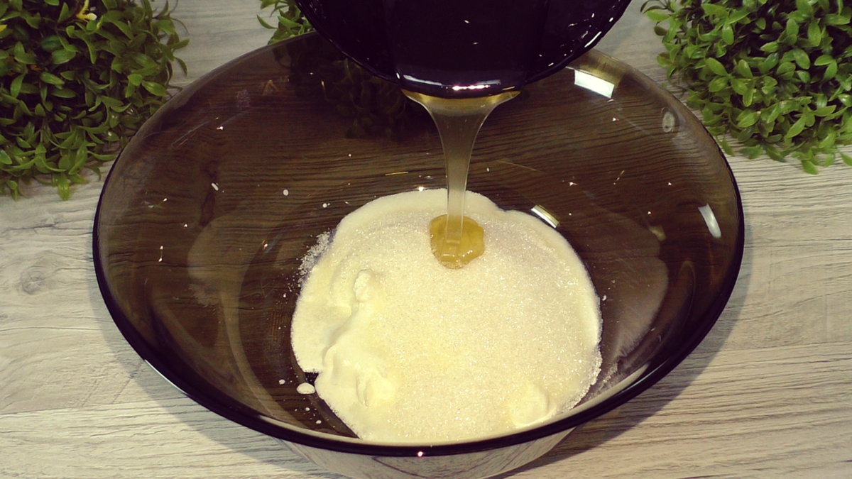 В глубокой миске смешиваются сметана и кефир, после чего добавляются соль и сахар. Затем добавляется мед — его лучше предварительно растопить на водяной бане, если он слишком густой. Наливается растительное масло, добавляются яйца и все ингредиенты тщательно перемешиваются венчиком.
