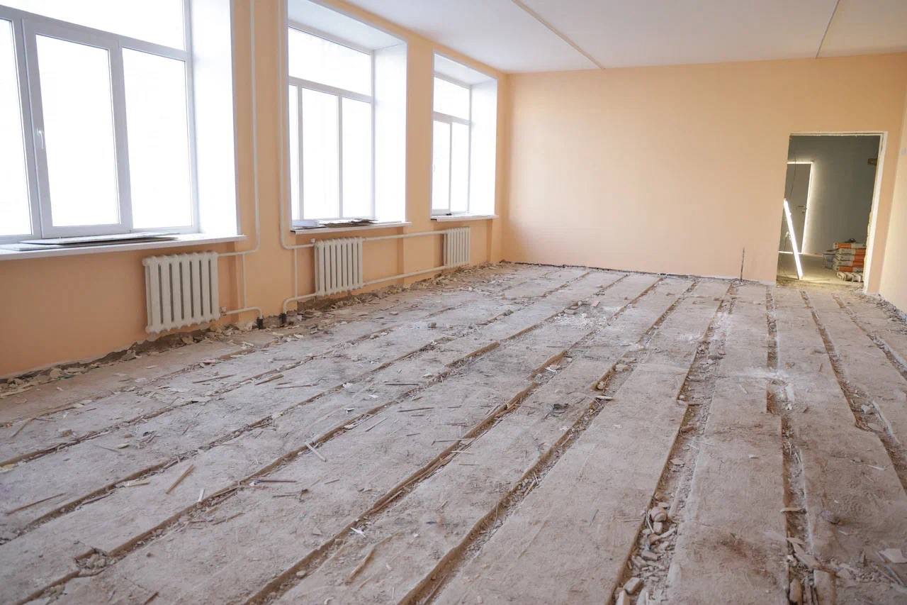 Ежедневно на объекте работают около 50 человек. Школу делаем полностью: кабинеты, коммуникации, вентиляцию, воду, отопление. Обновим мебель и оборудование. Дополнительно усилим безопасность — рассматриваем турникеты и рамки. Важно увидеть не только новую краску и новые покрытия, важно, чтобы это все радовало детей, родителей, учителей.