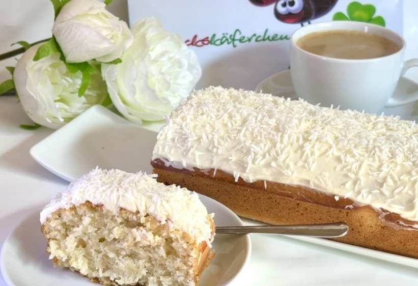 Нанесите крем на остывший кекс и посыпьте его кокосовой стружкой.