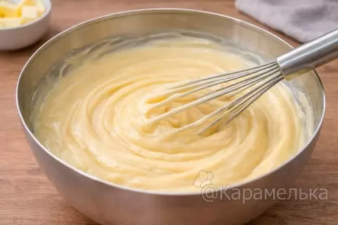 Для более плотной структуры охладить крем в холодильнике — это укрепит текстуру и облегчит сборку торта. Если нужен более выраженный сливочный вкус, уменьшите сахар в заварной основе: сгущёнка придаст необходимую сладость. Важное правило — соединять масло и заварную массу при одинаковой комнатной температуре, чтобы избежать расслоения.