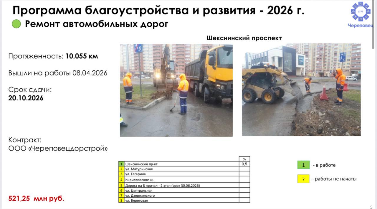 ремонт 10,055 километров автомобильных дорог - начали ремонт Шекснинского проспекта;