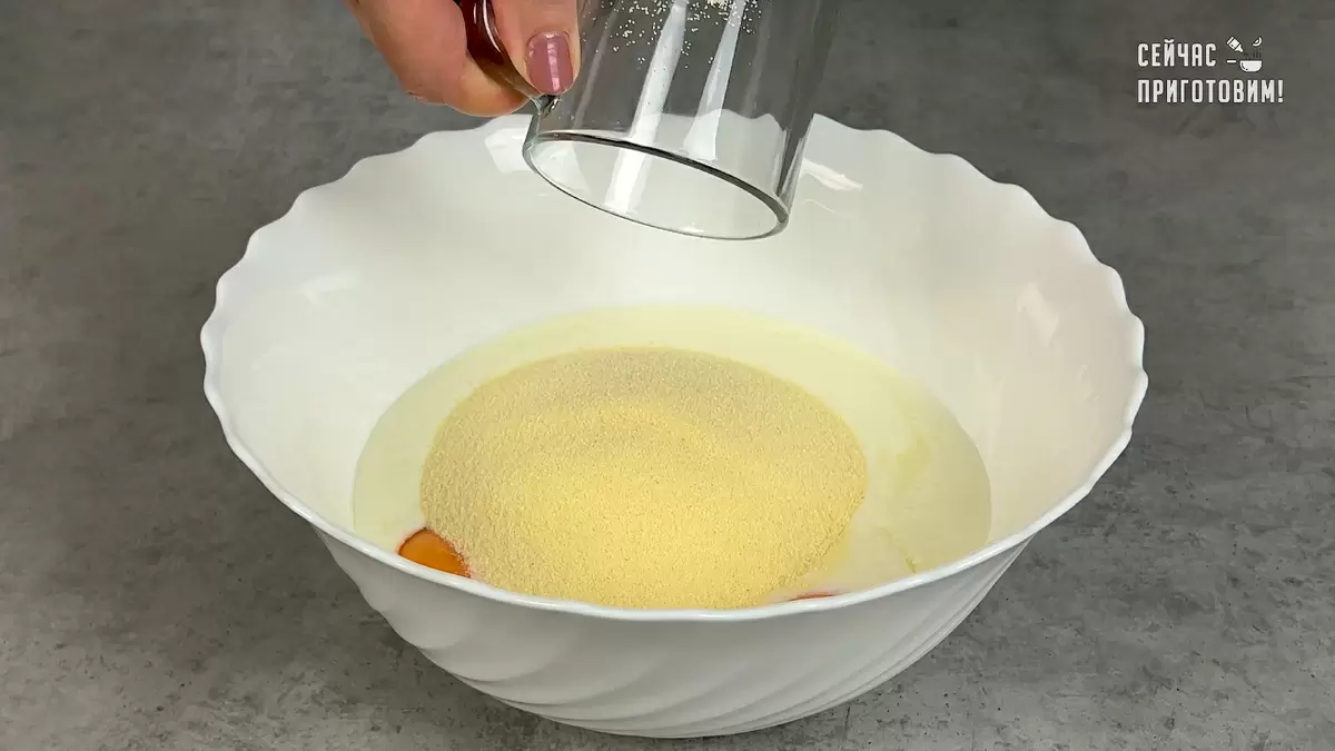 Начинать стоит с подготовки теста. В глубокой миске смешать яйца с щепоткой соли, затем добавить стакан сахара и влить стакан теплого кефира. Постепенно добавить стакан манки и тщательно перемешивать с помощью венчика или блендера. Дать тесту настояться на 10 минут, чтобы манка набухла.