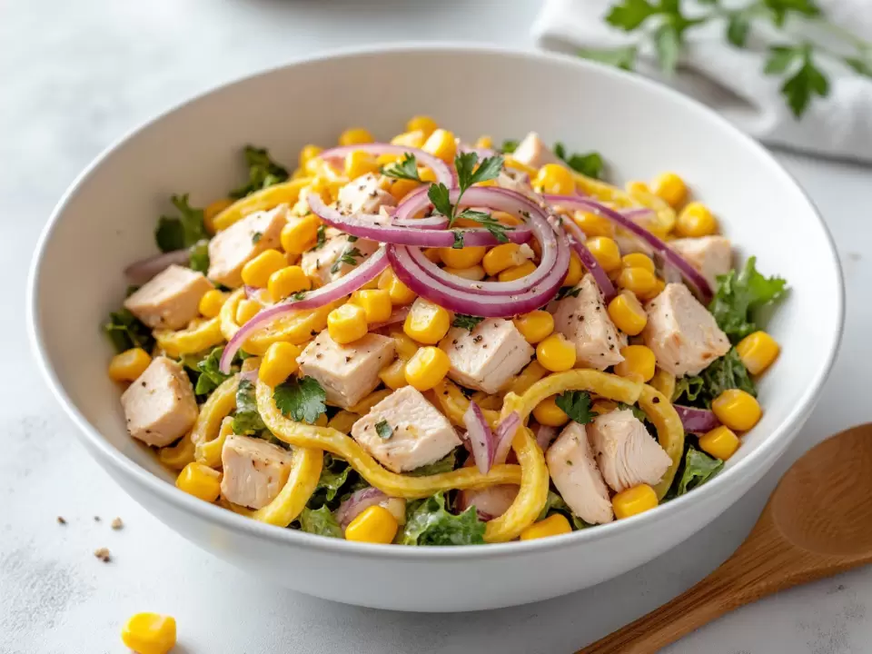 Копченая куриная грудка нарезается соломкой или кубиками. С кукурузы сливается жидкость. В большой салатнице соединяются все ингредиенты: курица, яичная соломка, маринованный лук и кукуруза. Перед подачей салат заправляется майонезом по вкусу. Главное — не переборщить, чтобы не утяжелить блюдо. Все тщательно перемешивается и оставляется на 5-10 минут, чтобы вкусы перемешались. Подавать рекомендуется сразу — пока яичная соломка остается хрустящей, а лук сохраняет свою текстуру.