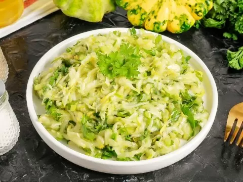 Салат из патиссонов обладает тремя основными благоприятными свойствами: он эффективно очищает кишечник, не перегружает желудок и отлично комплементарен к мясным и рыбным блюдам. Приготовить салат можно всего за 15-20 минут. Главное — правильно отжать из него сок, что позволит сохранить его текстуру и вкус даже в холодильнике.