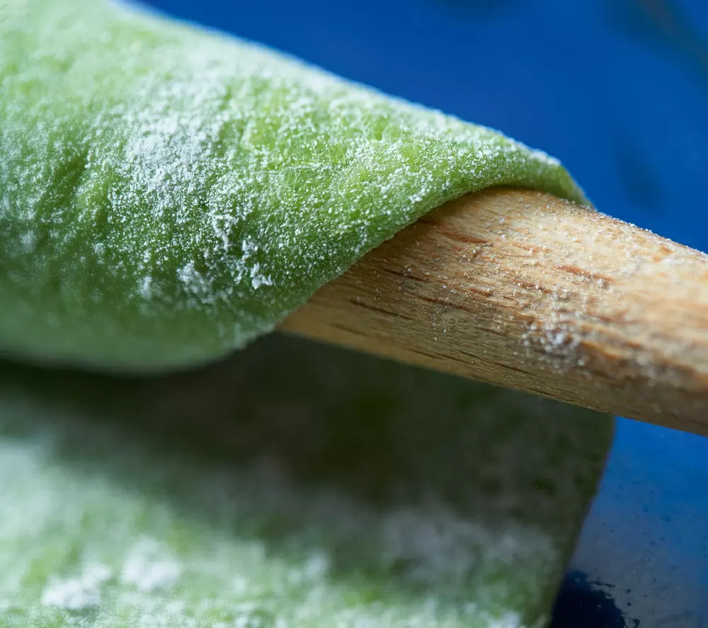 Процесс приготовления начинается с того, что шпинат тщательно промывают и превращают в пюре при помощи блендера, а затем отжимают сок. Муку следует просеять, добавить соль и сделать углубление, куда налить шпинатный сок. Постепенно добавляя воду, нужно замесить тесто до мягкости и эластичности. Далее тесто раскатывается в тонкий круг, обжаривается на раскаленном садже и режется на полоски.