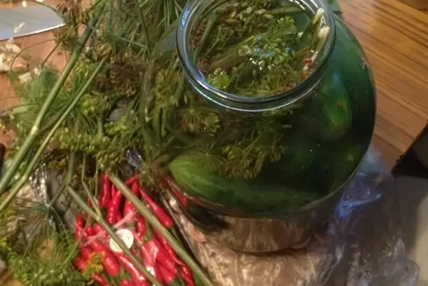 В первую очередь огурцы следует поместить в большую кастрюлю, залить чистой родниковой водой и оставить их на сутки для промывания.Через 24 часа чеснок очищается от шелухи, а зубчики слегка раздавливаются ножом.В подготовленные стерилизованные банки укладываются зубчики чеснока, перцы чили, листья вишни и черной смородины, а также веточка эстрагона и дубовые листья.Огурцы укладываются в банки плотно, добавляя укроп, который будет удерживать их на дне.Затем банки заливаются холодным рассолом, который готовится из расчета 2 столовые ложки соли на 1 литр воды, до самого верха.Банки стоит оставить в тёплом, темном месте на 3-4 дня, при этом необходимо снимать образующуюся пену каждый день.На четвертый день рассол переливается в кастрюлю, доводится до кипения, а банки необходимо промыть холодной кипяченой водой несколько раз, чтобы удалить остатки соли.Чистые банки заливаются слегка остывшим рассолом, закупориваются крышками и ставятся на хранение в прохладное место.Огурцы будут готовы уже через месяц или два. Этот простой рецепт доставит удовольствие любителям домашних заготовок и придаст разнообразия на столе. Приятного аппетита!