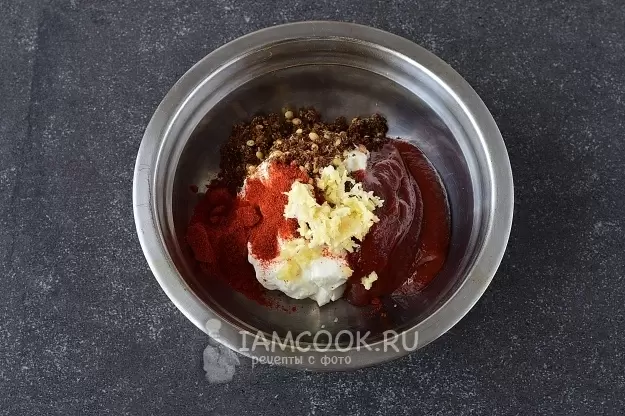 Для начала следует замариновать куриные ножки. В глубокой миске соедините йогурт и кетчуп, добавьте свежий натертый помидор, если желаете. Затем вводите приправу, молотый перец чили и раздавленный чеснок. Тщательно перемешайте до получения однородной массы.