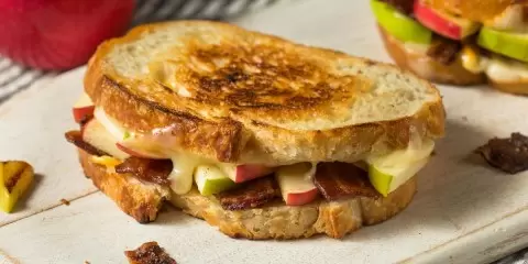 Для сборки сэндвичей нужно выложить слой сыра на один ломтик хлеба, добавить ломтики яблок, специи и жареный бекон. Если хочется некой сладости, можно добавить чуть меда, а затем накрыть все вторым ломтиком хлеба. При помощи остатка масла сковороду следует разогреть и обжарить сэндвичи с обеих сторон до появления золотистой корочки и расплавленного сыра.