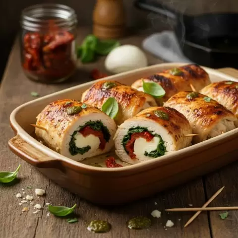Рулетики из куриного филе – это популярное и сытное блюдо, которое можно разнообразить множеством начинок. Сегодня предлагаем приготовить их с моцареллой, вялеными томатами и свежим шпинатом. Это идеальный вариант для семейного ужина или праздничного стола.