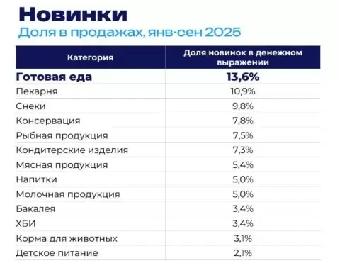 По данным аналитической компании NTech, продажи новых продуктов в сегменте пищевых товаров демонстрируют впечатляющие результаты за период с января по сентябрь 2025 года. В топ-5 категорий с самым высоким количеством новинок вошла рыбная продукция, занимая значительную долю в 7,5%. В то же время мясные изделия заметно отстали, продемонстрировав всего 5,4%.