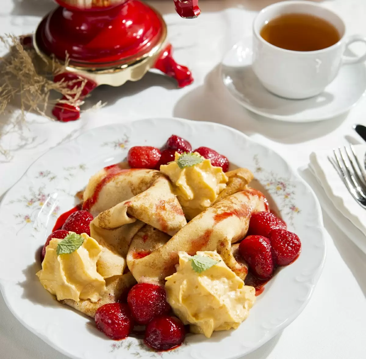 - Блинчики на фермерском молоке с кремом из маскарпоне и клубникой фламбе — истинное наслаждение для сладкоежек.