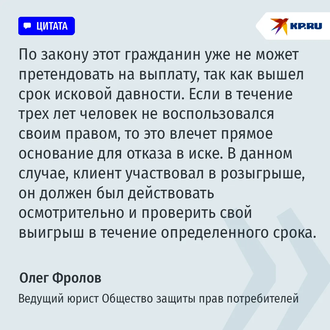 Но не стоит думать, что герой публикации действительно опростоволосился. Все дело в том, что билетик он купил в июле 2017 года, а розыгрыш прошел почему- то в августе 2020-го (да-да!). Такое бывает, когда организаторы при завершении продаж переводят билеты конкретного тиража на последующие розыгрыши. Когда Андрея признали победителем, по правилам у него было всего 6 месяцев на то, чтобы получить вознаграждение. Как мы уже знаем, с организаторами он не связался в нужный срок и денег не получил.