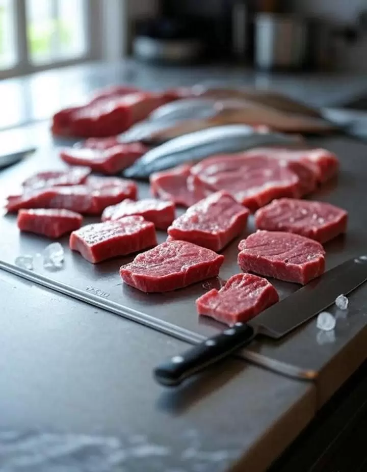 Нарезка мяса и рыбы может показаться сложной задачей, особенно когда речь идет о тонких ломтиках для карпаччо или суши. Но есть простой трюк: легкое охлаждение продукта перед нарезкой значительно упрощает процесс. Когда мясо или рыба кратковременно охлаждаются в морозильной камере, структура их ткани становится более плотной и упругой, что позволяет избежать разрывов и неровностей при нарезке.