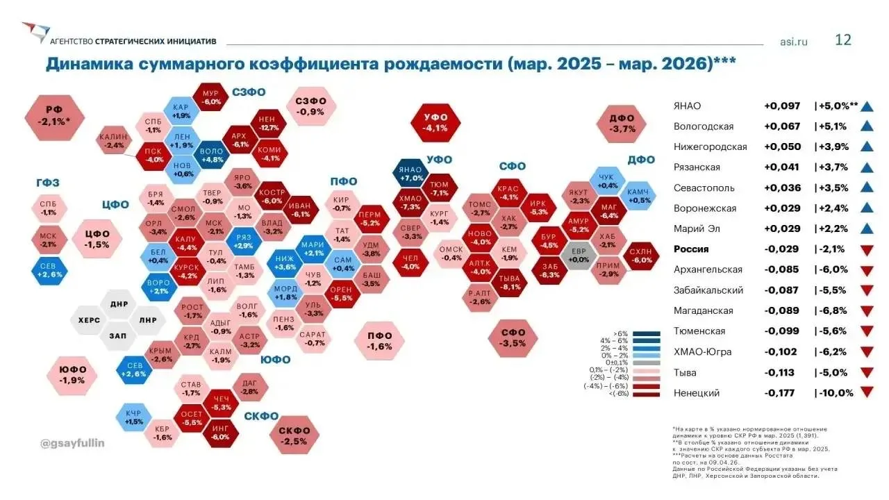 По итогам марта 2026 года суммарный коэффициент рождаемости составил 1,386 единицы. Это выше, чем в среднем по СЗФО (1,217) и по стране (1,362).