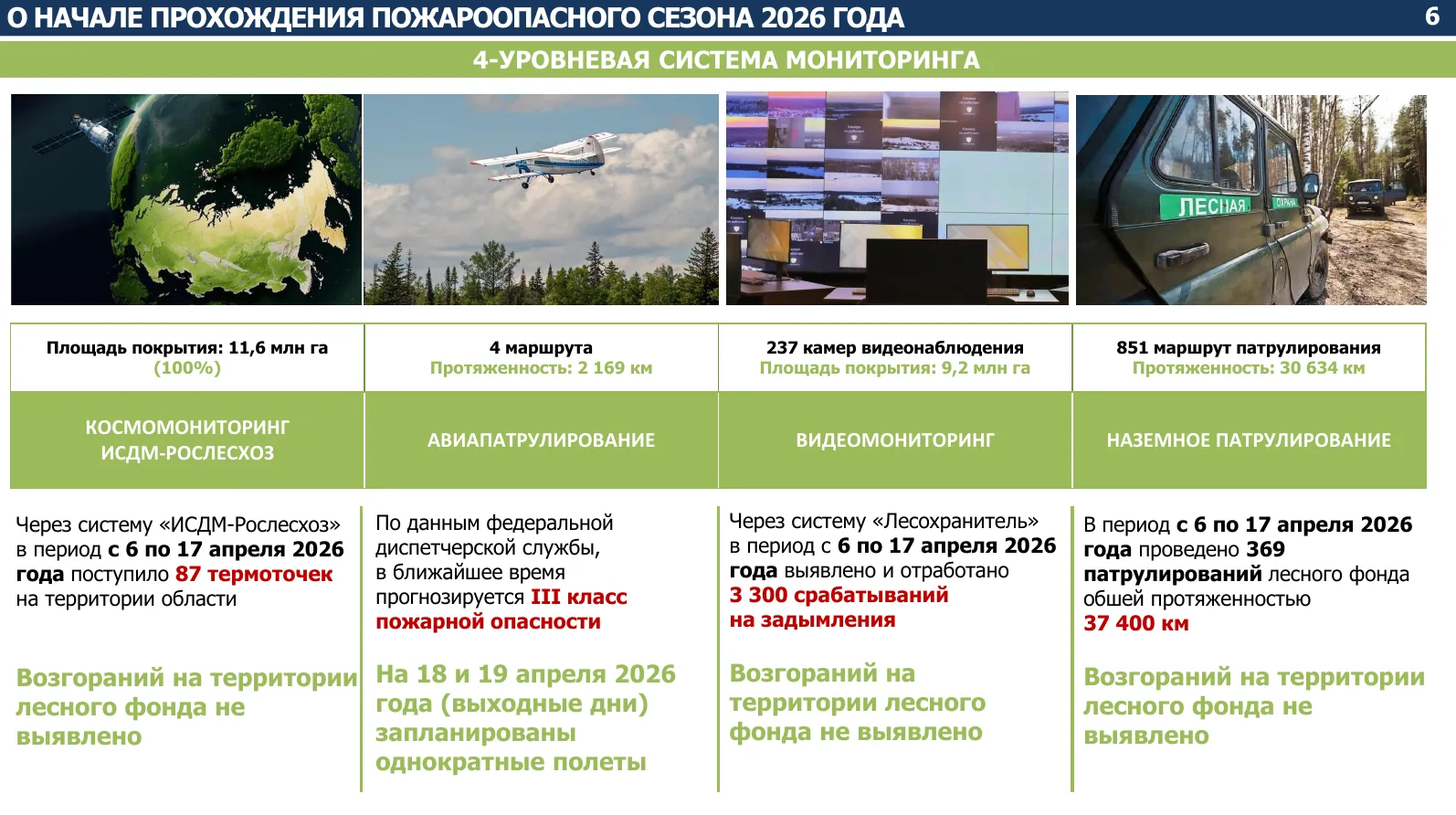 В период с 6 по 17 апреля 2026 года проведены 369 вылетов воздушной патрульной службы, охвачено 37 400 га лесного фонда. В системе "Лесопожарный" зарегистрировано отсутствие возгораний на территории лесного фонда.