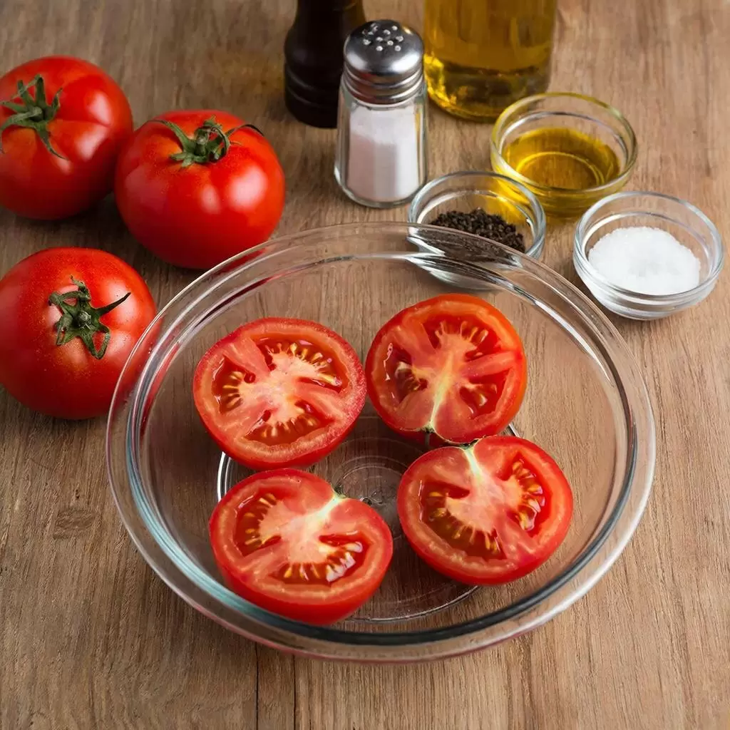 Приготовление уникальной закуски на основе помидоров — это легко и увлекательно! Для начала необходимо взять крупные помидоры и аккуратно нарезать их на 2-4 части, в зависимости от предпочтений. Важно удалить семена, чтобы избежать лишней влаги в готовом блюде. Нарезанные помидоры поместить в глубокую посуду, добавить растительное масло, щепотку соли, перца и немного уксуса. Дать им помариноваться в течение 1-2 часов, чтобы они успели напитаться вкусами.