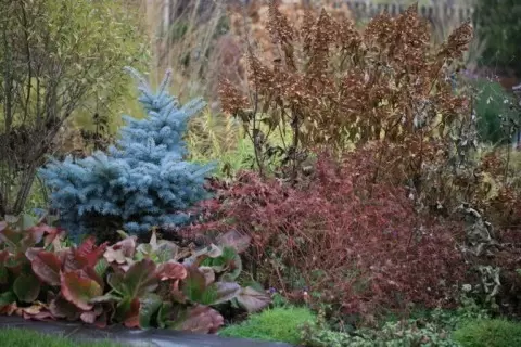 - Хвойные растения: Добавление компактных хвойников, таких как «шаровые» туи и сортовые ели, поможет создать выразительные акценты в вашем саду. Они не только добавят зелени, но и выделяются своей формой и текстурой, особенно зимой.