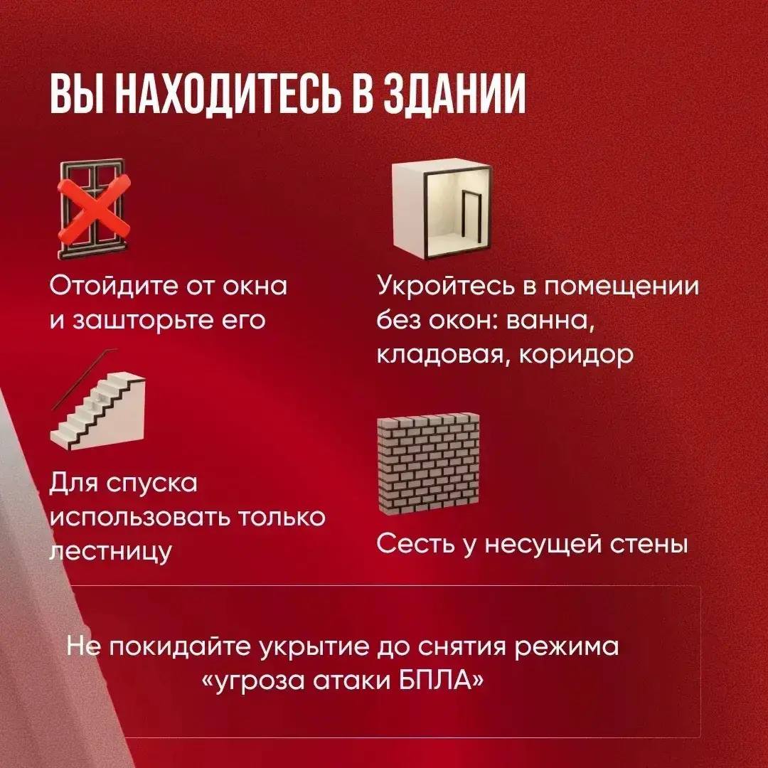 Прошу вас сохранять спокойствие и соблюдать меры безопасности. Не выходите из укрытий до отмены режима «Беспилотная опасность».