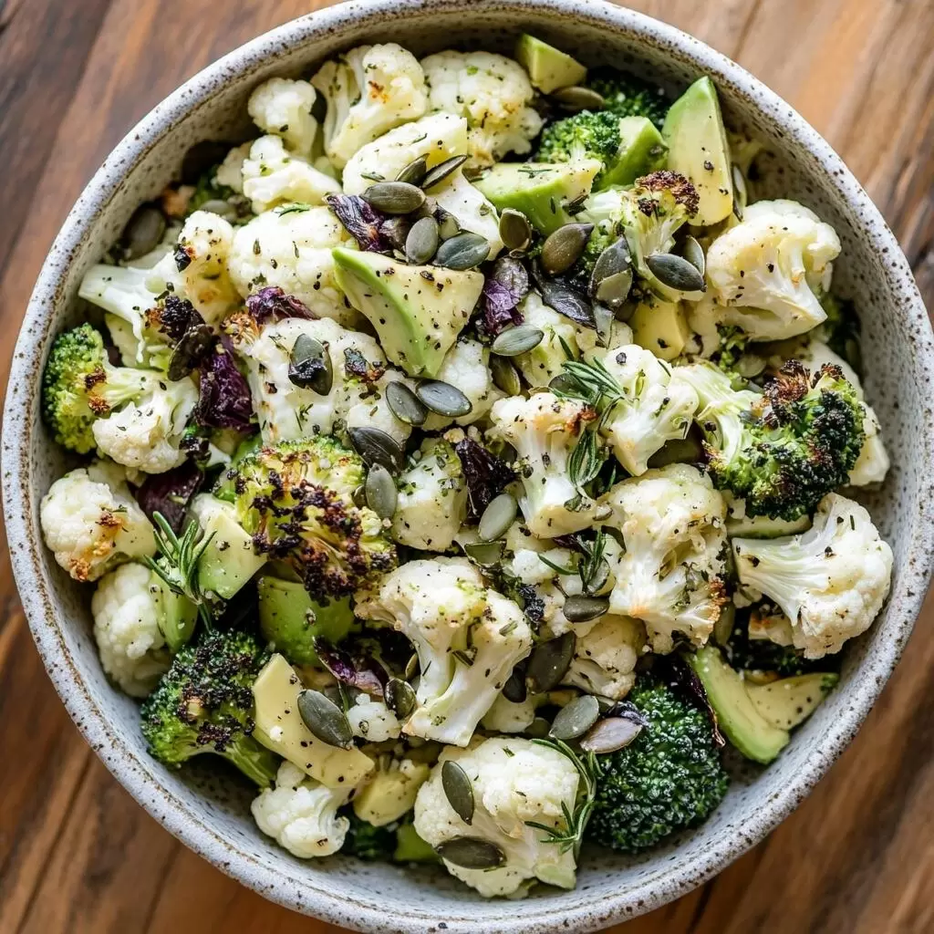 Смешивайте брокколи и цветную капусту с оливковым маслом и солью, затем запекайте в духовке при 180°C в течение 10-15 минут, перевернув в процессе. Готовую капусту перемешайте с авокадо, заправкой из шалфея, семенами и изюмом, посыпьте кинзой и добавьте несколько капель лимонного сока для яркости вкуса.
