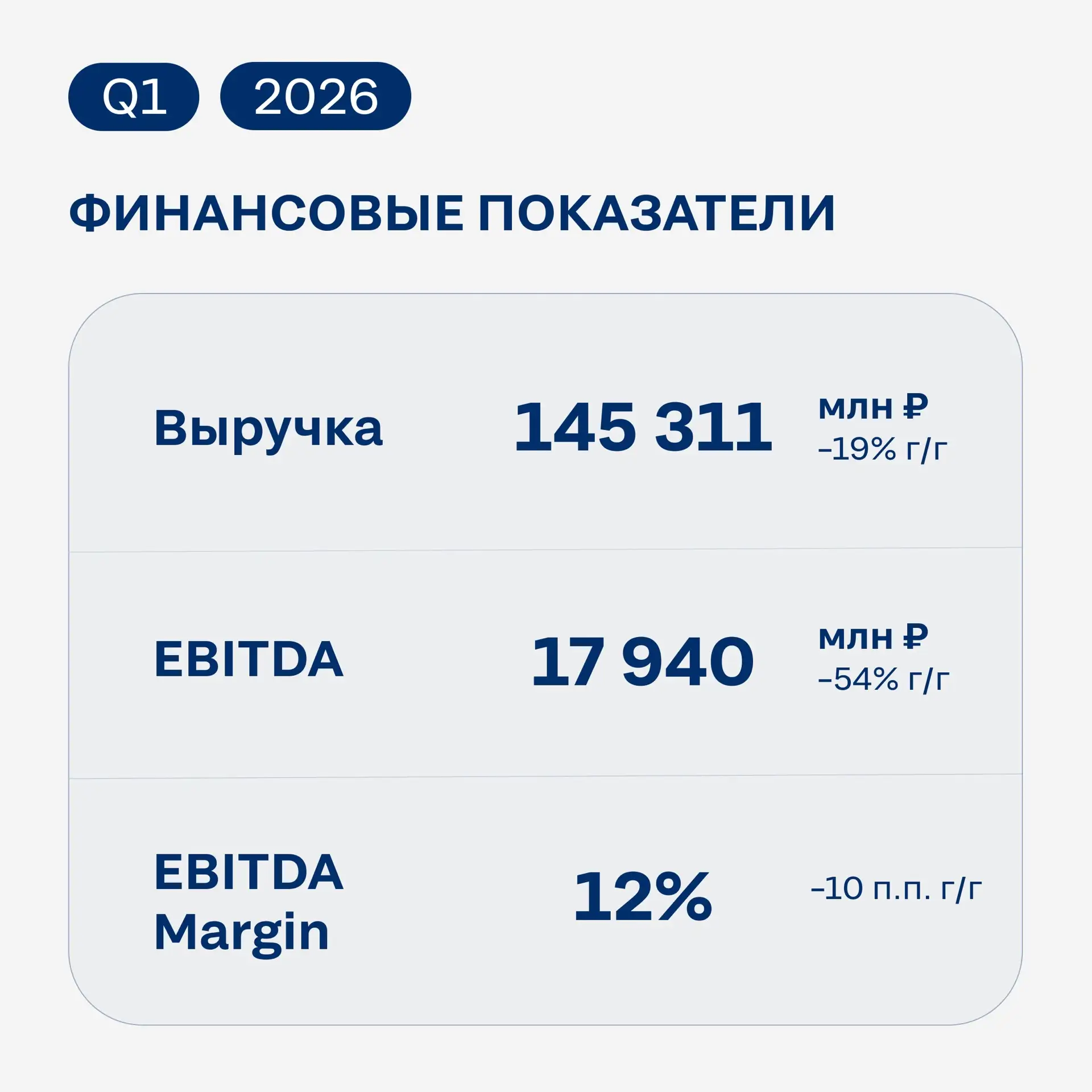 Однако из-за роста доли полуфабрикатов в портфеле продаж и снижения средних цен реализации выручка в 1 квартале 2026 года снизилась на 19% г/г — до 145,3 млрд рублей. Показатель EBITDA уменьшился до 17,9 млрд рублей при рентабельности по EBITDA 12%.