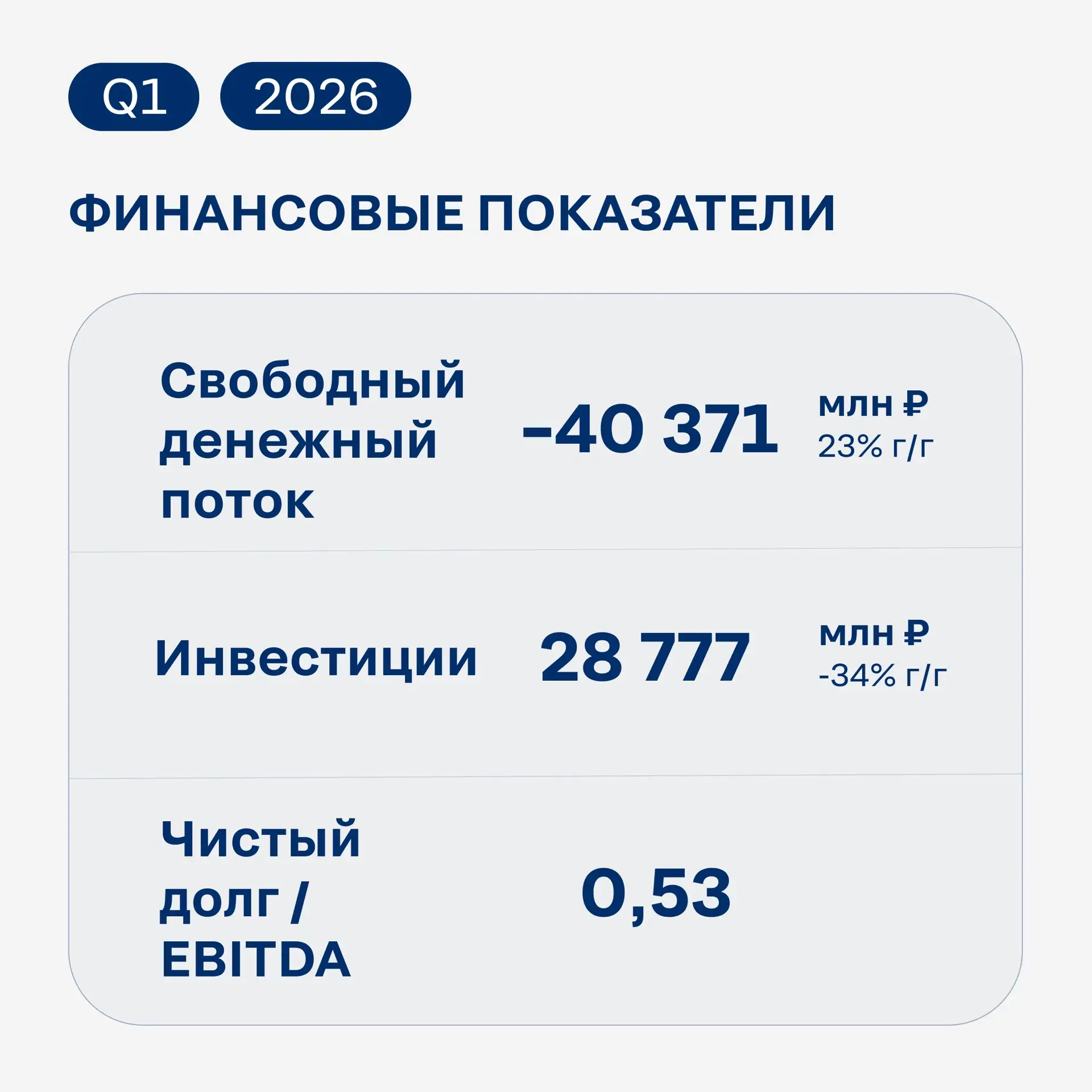 В условиях непростой макроэкономической ситуации мы приняли ряд проактивных мер для обеспечения финансовой устойчивости. В частности, мы приняли решение сократить ремонтный фонд в 2026 году относительно ранее принятых планов на 14%, а бюджет капитальных вложений — на 24%. При этом мы продолжим реализацию крупных стратегических проектов, которые закладывают основу нашей будущей конкурентоспособности и экологичного будущего в регионах присутствия, — таких как строительство цеха по производству железорудных окатышей. Общий объём инвестиций в 1 квартале составил 28,78 млрд рублей, что на 34% ниже прошлогоднего рекордного уровня. На фоне значительных инвестиций и оттока денежных средств на пополнение оборотного капитала (за счет роста запасов готовой продукции перед началом навигационного сезона, а также увеличения торговой дебиторской задолженности в основном из-за увеличения сроков расчетов с клиентами) свободный денежный поток является отрицательным и составил -40,37 млрд рублей. Отношение чистого долга к EBITDA на конец квартала остается на достаточно комфортном уровне 0,53, некоторый рост относительно предыдущего периода обусловлен снижением показателя EBITDA.