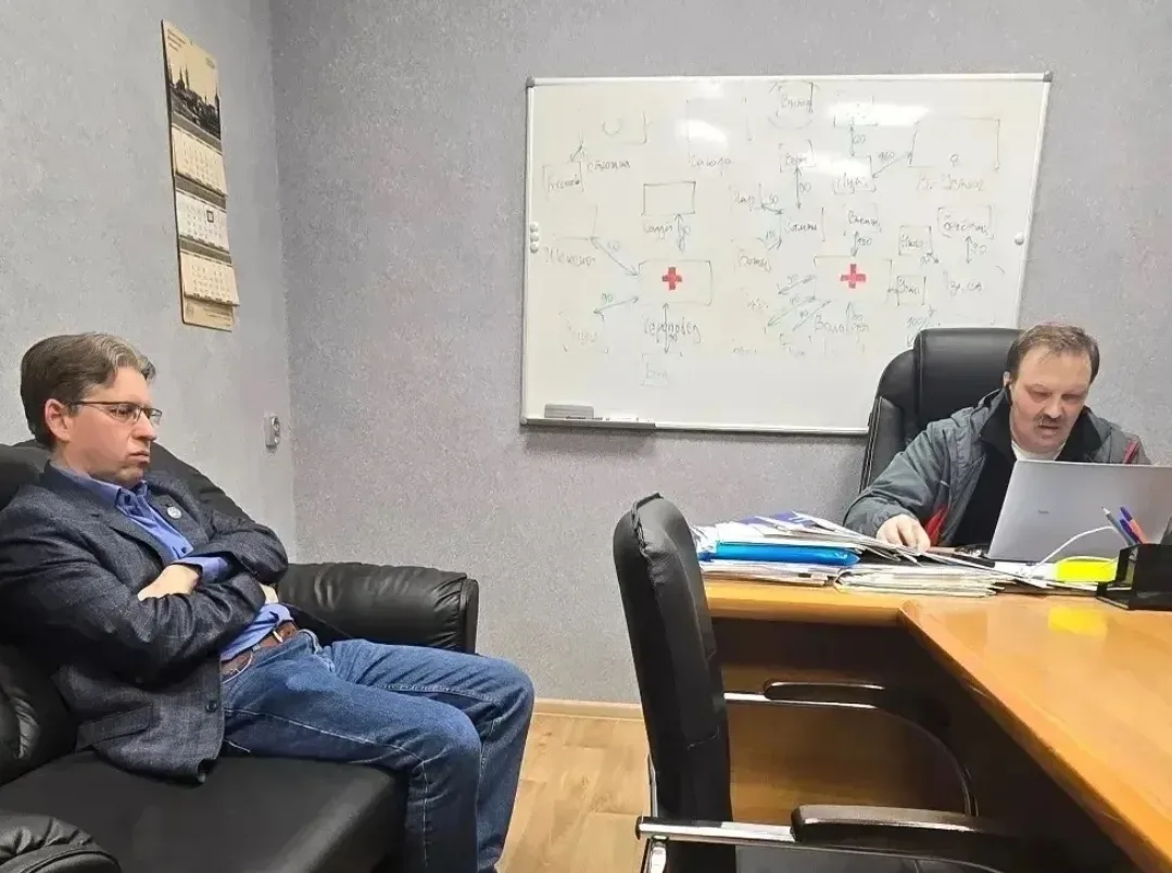 На данном фото Виктор Бурсин сидит в своем кабинете, а за его рабочим компьютером находится руководитель одной из IT-компаний Андрей Ступников.