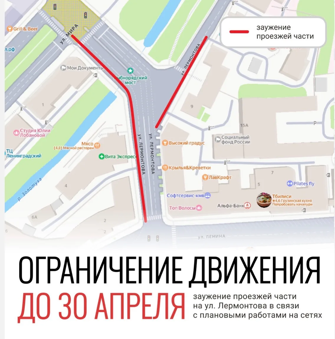 Движение не будет перекрыто, но проезжая часть будет заужена. Все работы на сетях на улице Лермонтова планируется завершить до 30 апреля