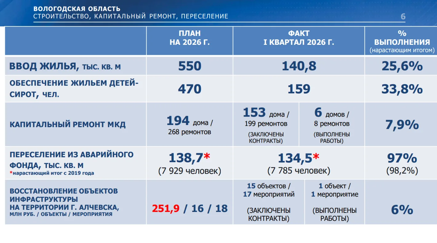 134,5 тыс. кв. м аварийного жилья расселено в Вологодской области с 2019 года — это 7785 человек. Такие данные на 1 квартал 2026 года прозвучали в докладе Александра Мордвинова губернатору. Плюс 6 домов и 8 ремонтов по программе капремонта МКД.