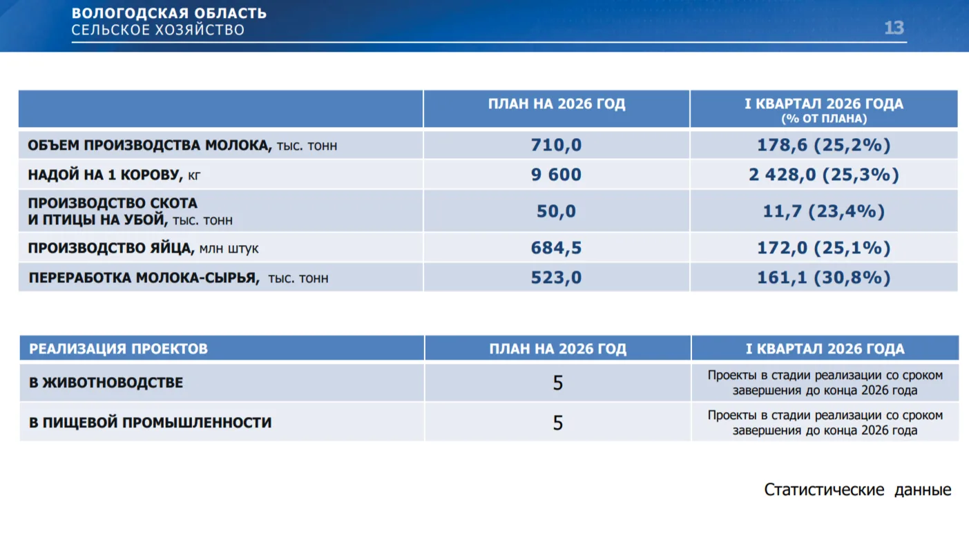 По данным за первый квартал 2026 года, выполнено:178,6 тыс. тонн молока (25,2% от плана на 2026 год).2,428 кг на одну корову (25,3% от плана).11,7 тыс. тонн производства скота и птицы на убой (23,4% от плана).172,0 млн яиц (25,1% от плана).161,1...