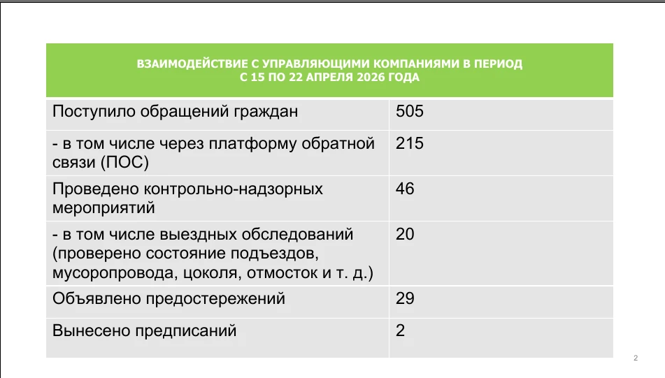 Проведено 46 контрольных и надзорных мероприятий, включая 20 выездных обследований состояния подъездов, мусоропровода, цоколей, отмосток и других объектов.